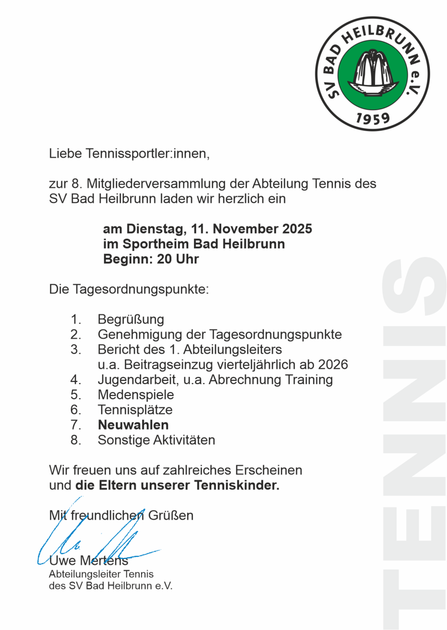 8. Mitgliederversammlung 11.11.2025, 20 Uhr Sportheim